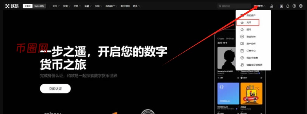 登录OKX(欧易)交易所后,点击页面顶部的充币选项,APP和网页版都大致相同。